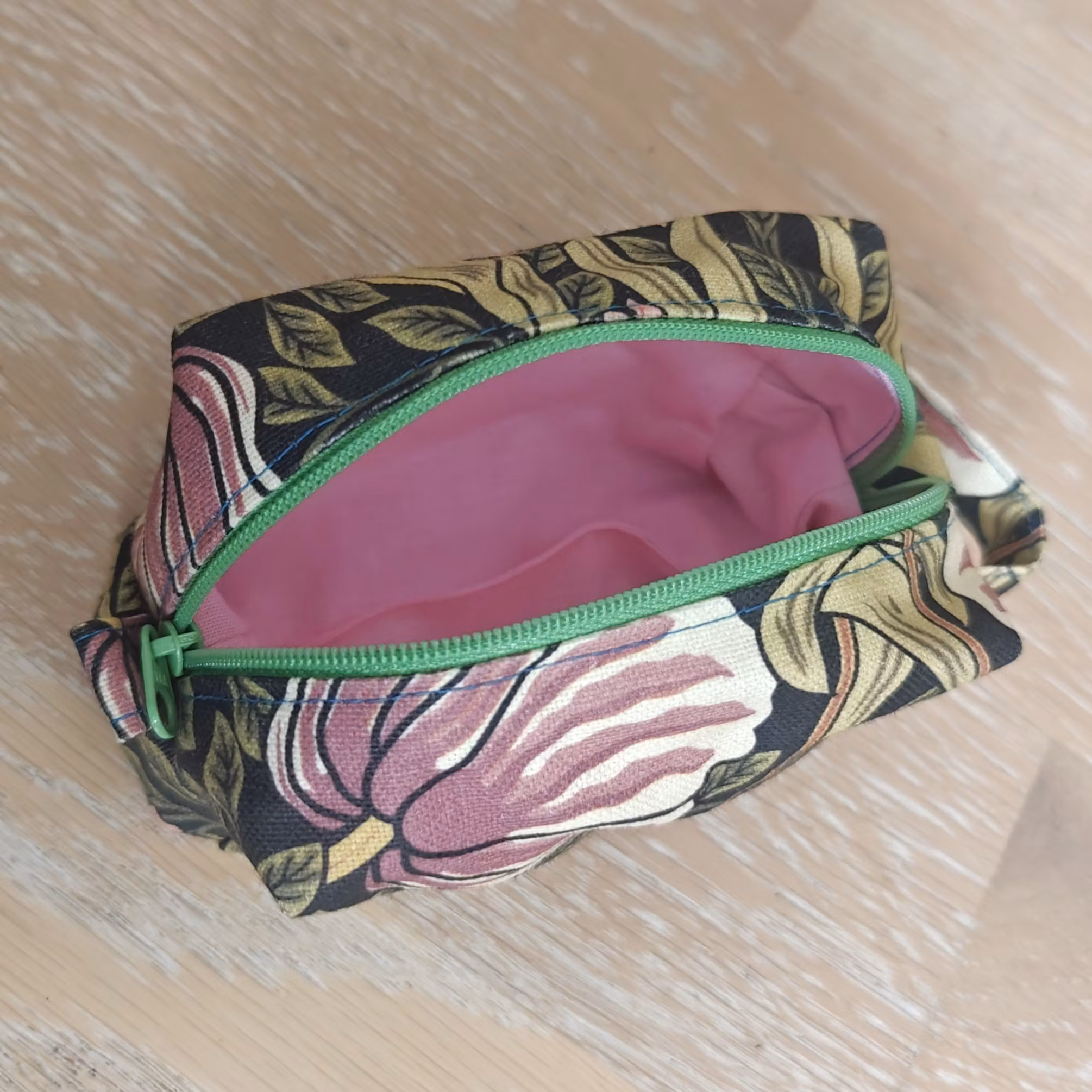 Alla necessär är unika och ingen den andra lik och denna är blommig i rosa, svart och grönt på utsidan , rosa insidan, grön dragkedja och blåa sömmar.