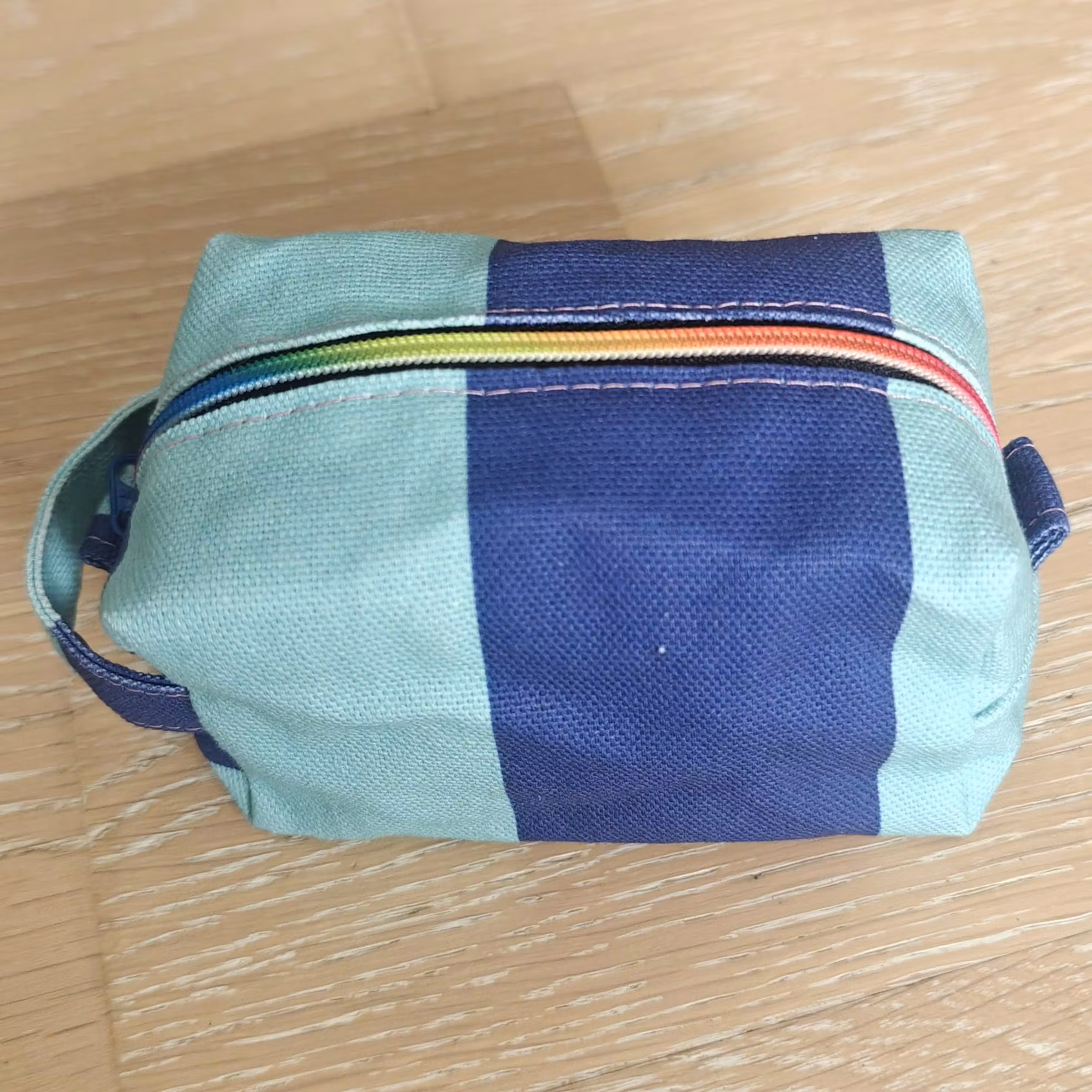 Alla necessär är unika och ingen den andra lik och denna har en blå randig utsidan, mörkgrön insidan, multifärgad dragkedja och rosa sömmar.