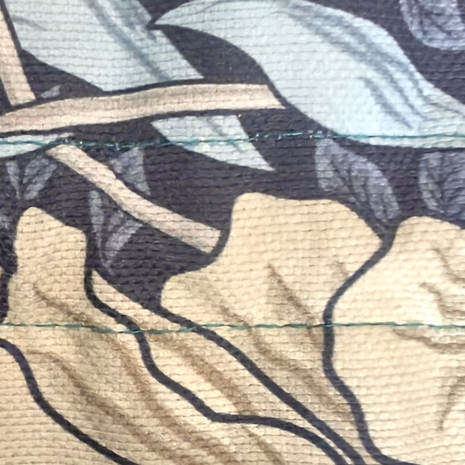 Denna väska är blå med beiga blommor på utsidan, ljusgrön på insidan, fickor i blå och orange randigt tyg och sömmar i turkos.