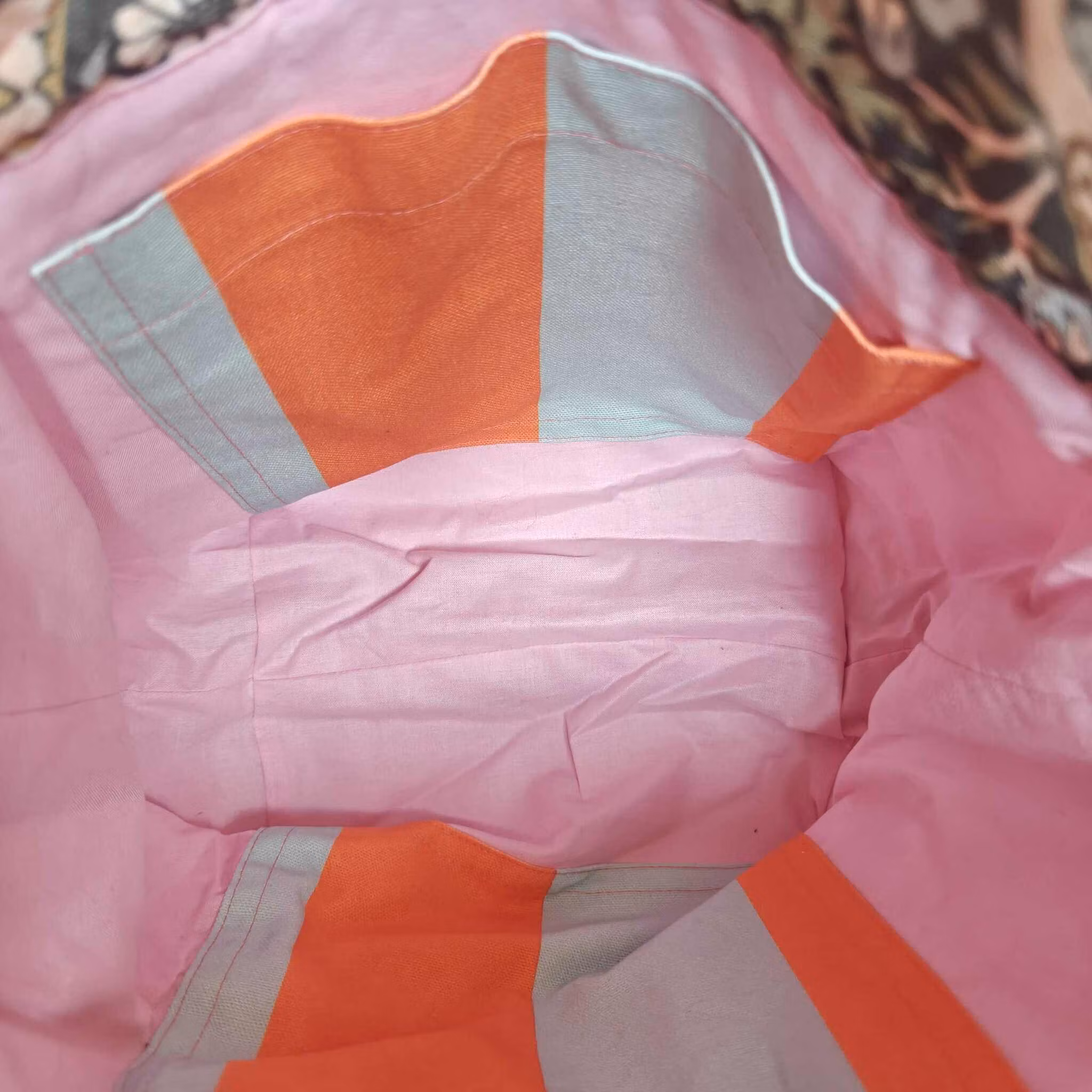 Denna väska är med blommor, fåglar och jordgubbar på utsidan, rosa på insidan, fickor i blå och orange randigt tyg och sömmar i rosa.