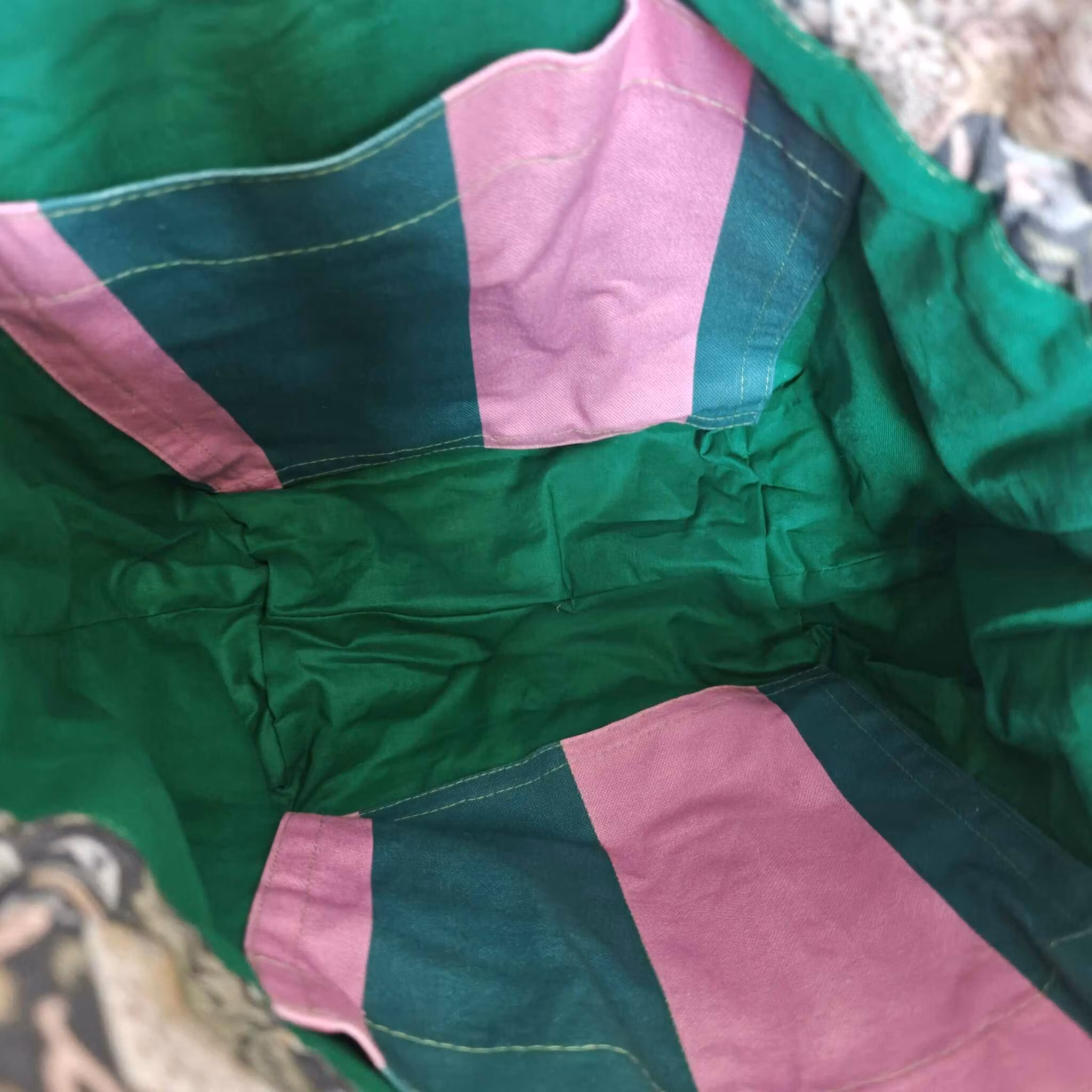 Denna väska är med blommor, fåglar och jordgubbar på utsidan, grön på insidan, fickor i turkos och rosa randigt tyg och sömmar i grönt.