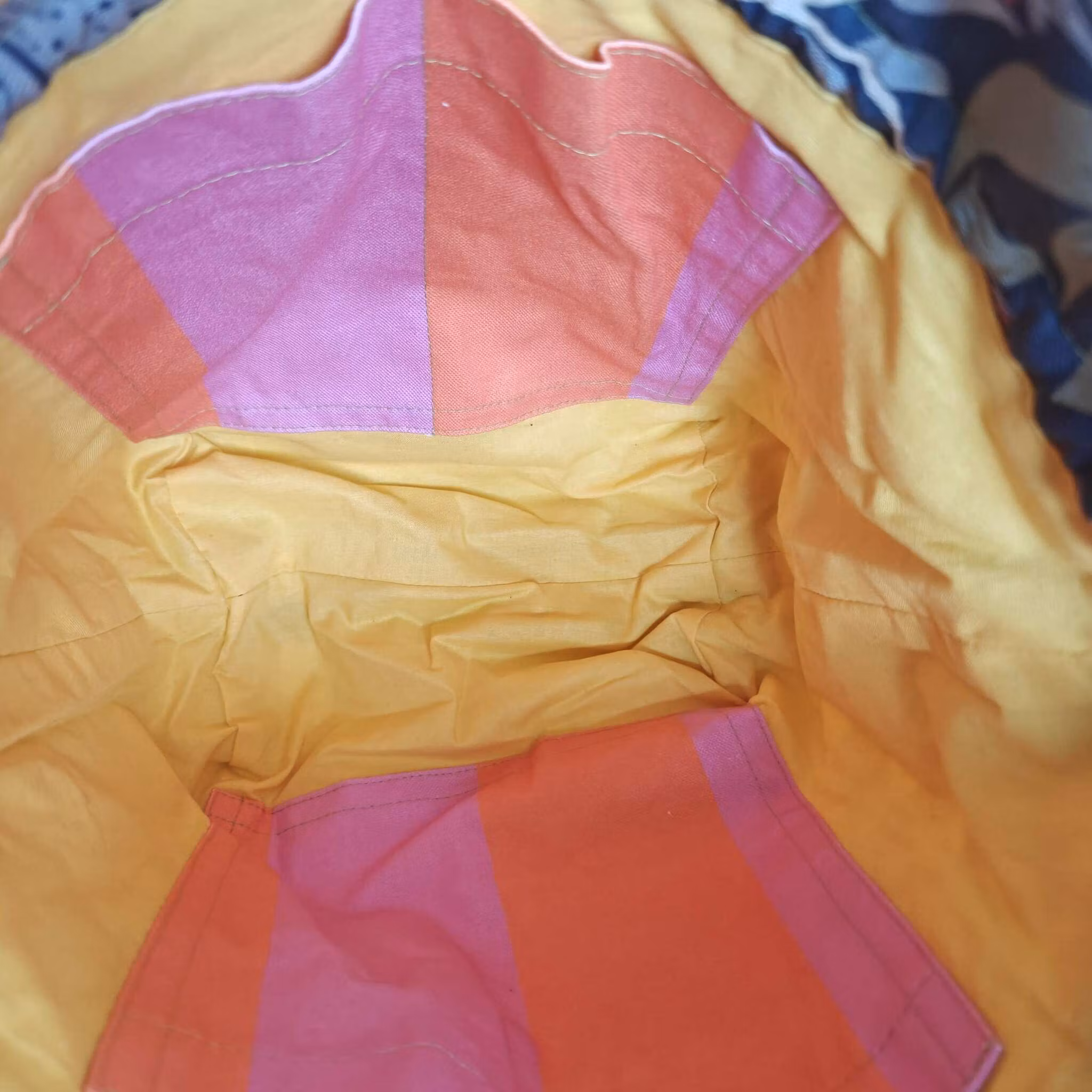 Denna väska är mörkblå med blommor, fåglar och jordgubbar på utsidan, gul på insidan, fickor i orange och rosa randigt tyg och sömmar i grönt.