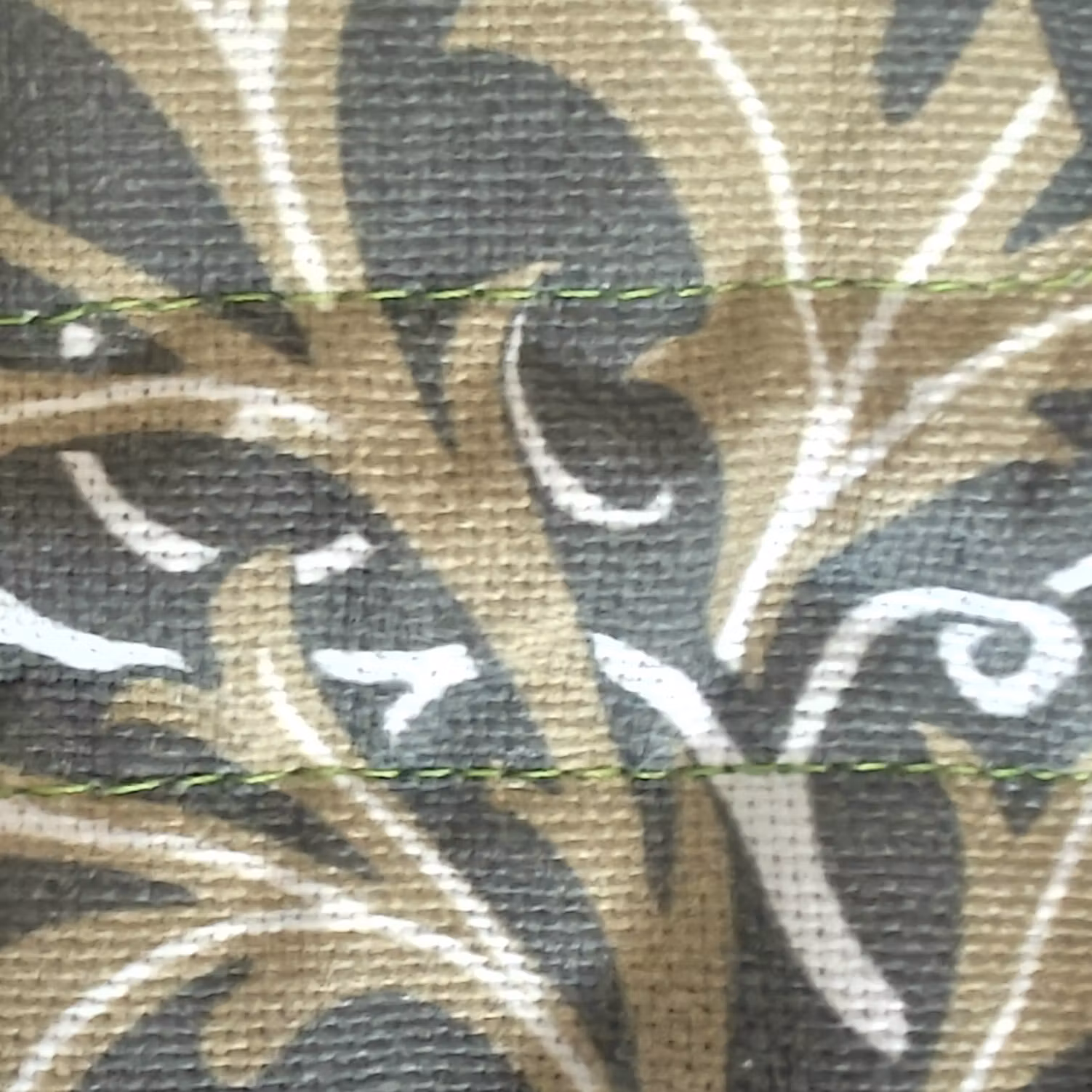 Denna väska är blommig på utsidan, mörkgrön på insidan, fickor i rosa och orange randigt tyg och sömmar i grönt.